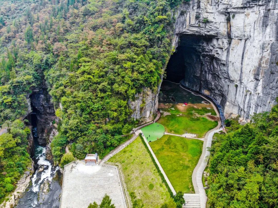 腾龙洞位于湖北省利川市近郊清江上游,如果用一个词形容它,那就是震撼。如果你去腾龙洞,可能“未见其洞,先闻其声”,距离洞口两三公里就能听到一阵如雷般的水声。这是清江到腾龙洞口的瀑布的声音,瀑布落差30多米,宽50多米,紧接便着跌入长达16.8公里洞口中,就像一条腾空而起又潜入地下的巨龙一样,这就是“卧龙吞江”。