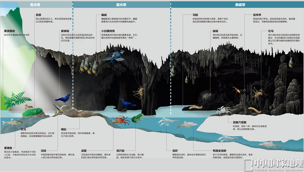洞穴常见生物分布示意图