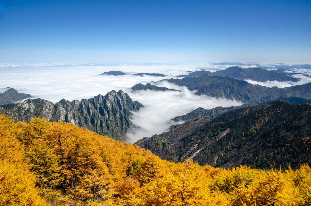 太白红杉是秦岭典型的林线树种,它如卫士般守护着秦岭山地森林分布的最上限。而这一路上是数不尽的金黄色飞扑进你眼中,或深或浅,还有太白山独特的云海和石海,秋景不过如此。