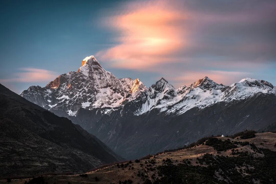 四姑娘山也是如此,雪线下方是一圈又一圈的自然带。四姑娘山地处横断山脉北段向四川盆地过渡的边缘地带, 属典型的高山峡谷地貌,有着非常丰富的高山植被。