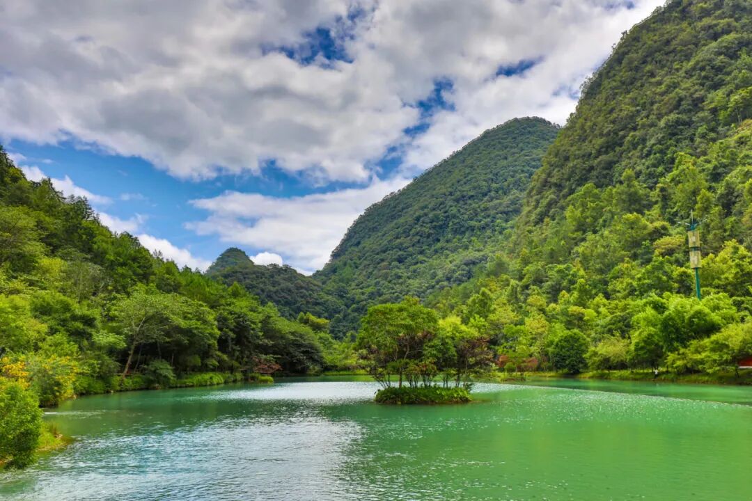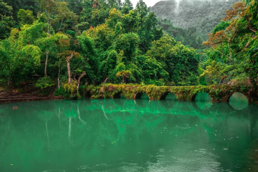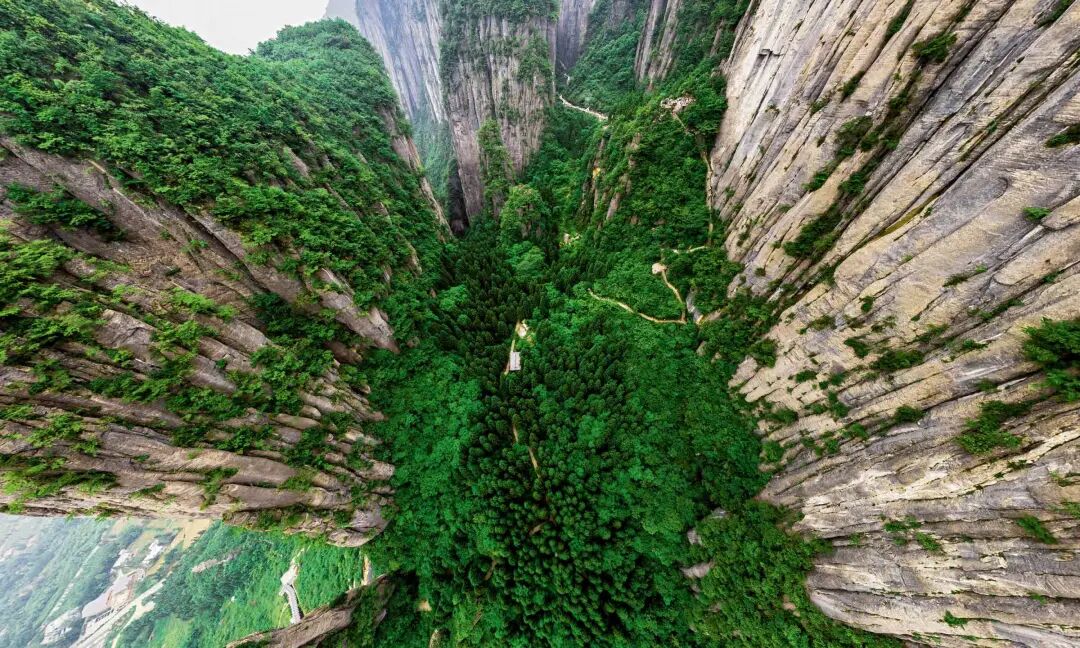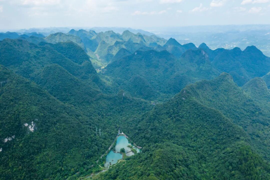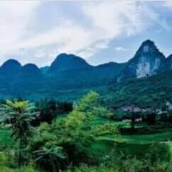 片片新绿和青褐色的青岩在蓝天下各得其妙