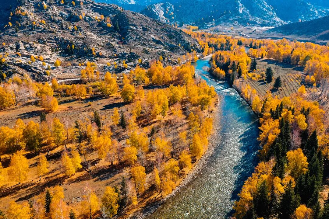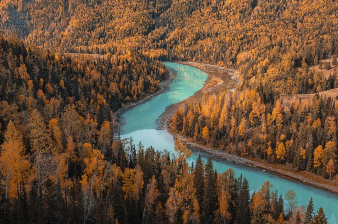 来到阿勒泰地区,中国最美秋景映入眼帘。喀纳斯被誉为天山以北中国最美的去处,这里色彩缤纷,流光溢彩,是混合色、油画色。站在高坡上向下望去,月亮湾尽收眼底,满目秋色,遍地金黄。一条碧蓝的小河如玉带一般穿过密林,蜿蜒曲折形成一弯月牙。它穿过河谷,走过树林,迂回曲折,缠缠绵绵,最后又悄无声息地流向远方,消失在这满目金色的秋意之中。