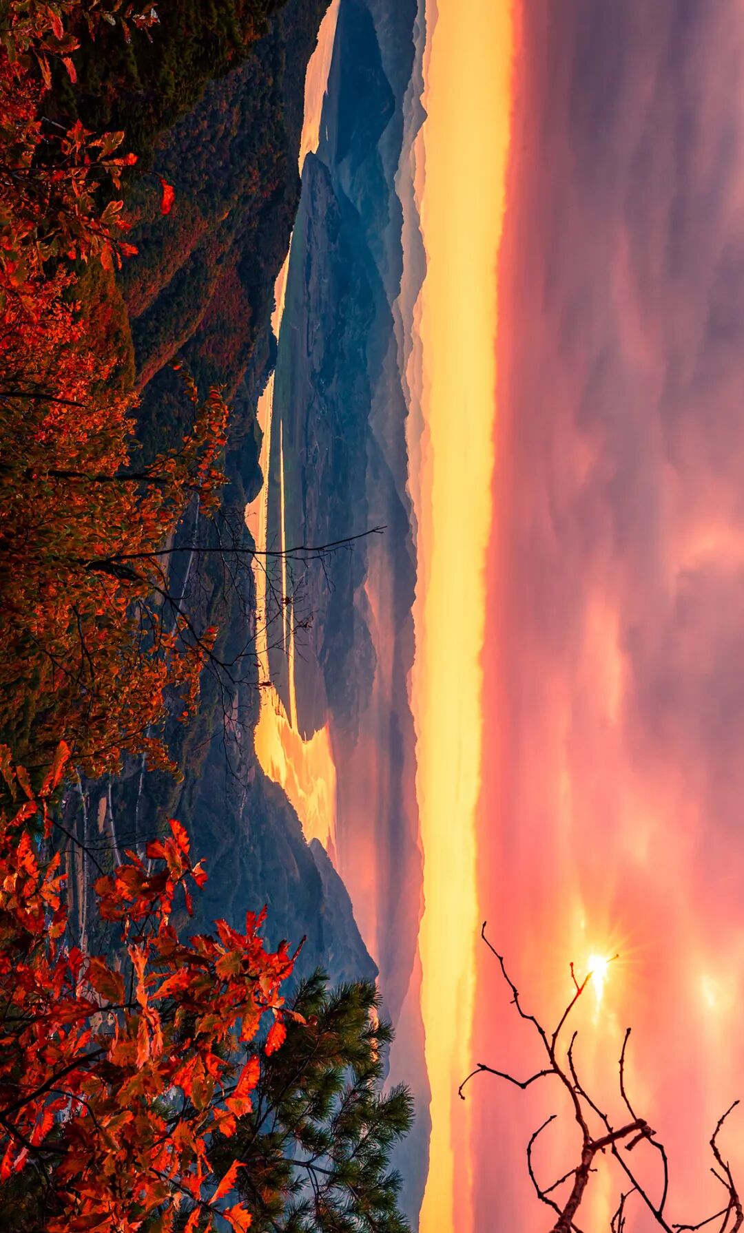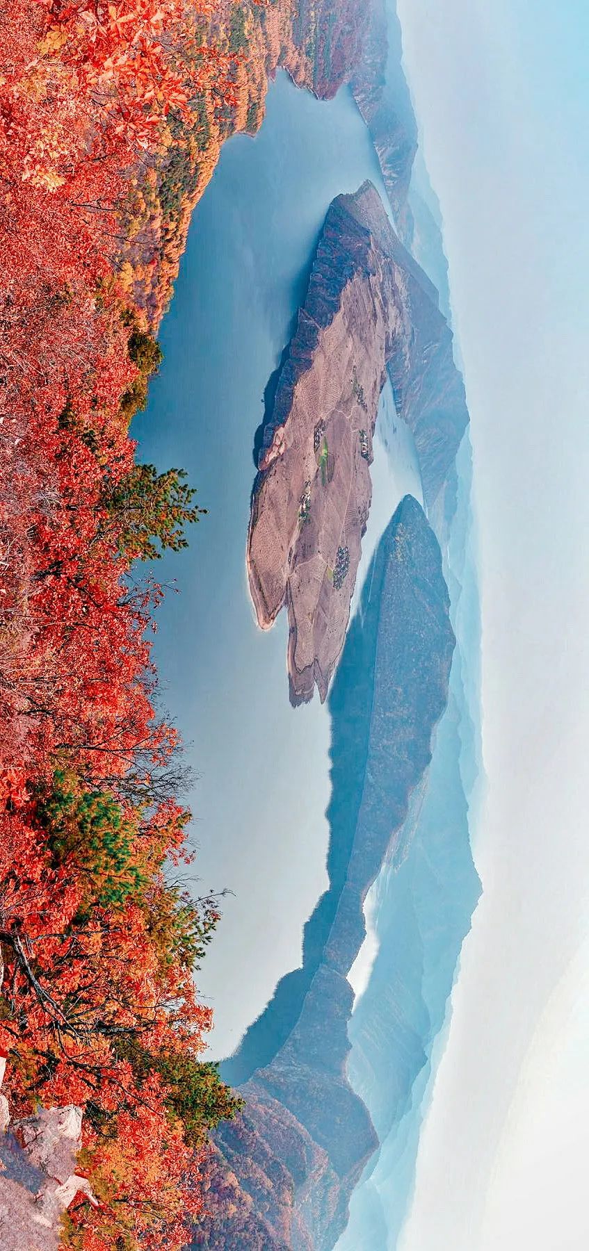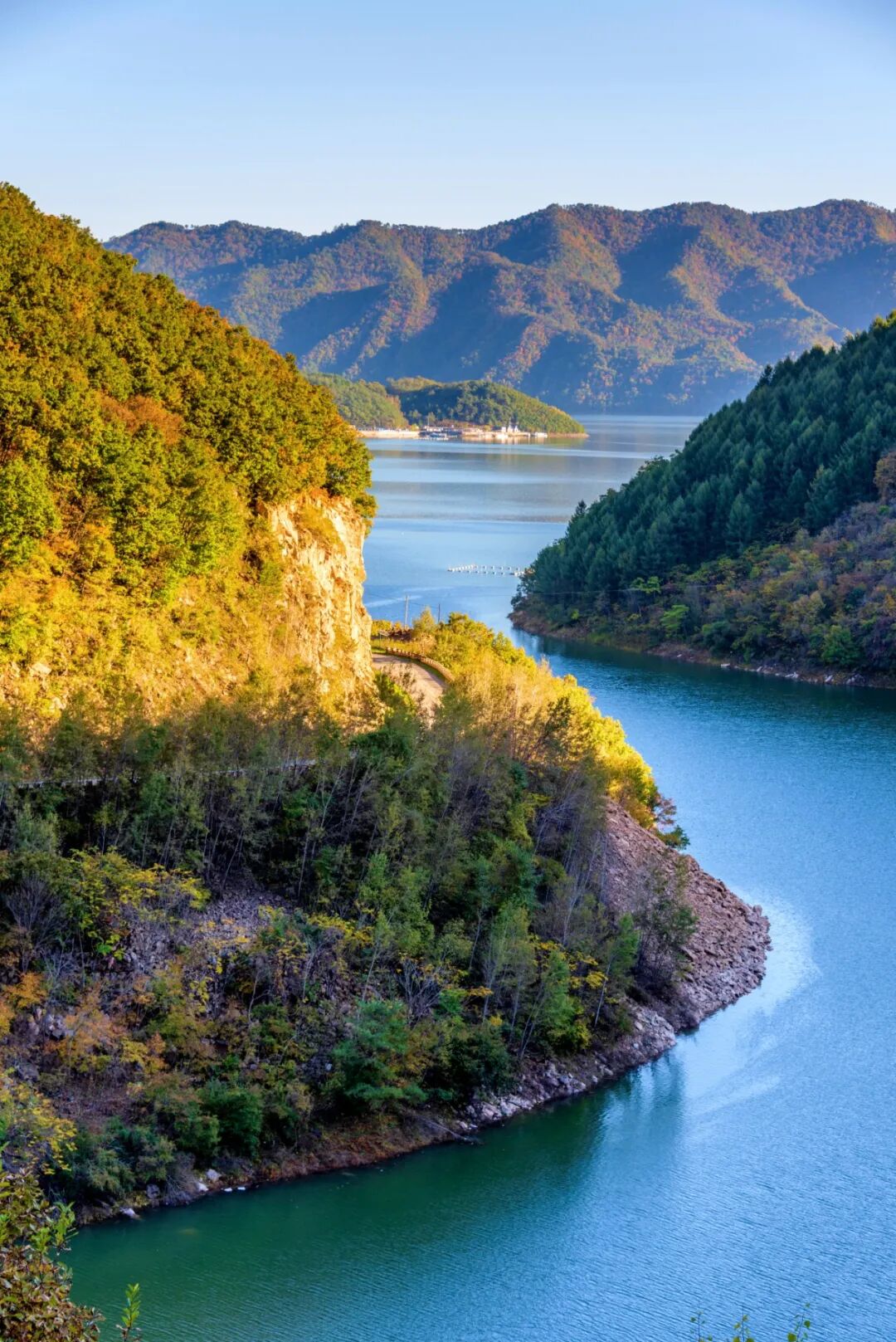 在丹东稍作停留后,沿江继续行进。来到丹东绿江村,鸭绿江在这180°大回转,形成半岛状的绿江村。这里山水交织,绵绵的鸭绿江水滋养着这里的村民,与朝鲜隔江相望。秋天山林草木层林尽染,多彩云霞相衬,这便是绿江村醉人的深秋景。