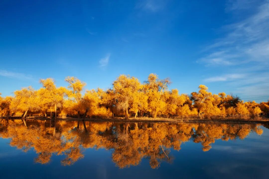 向西穿过沙漠,来到额济纳旗镇。这里多为无人居住的沙漠区域,著名的酒泉卫星发射中心就位于这里。在浩瀚沙海边缘,顽强的胡杨生而千年不死,死而千年不倒,造就了额济纳旗的名片——沙漠胡杨。此时正是赏胡杨的最佳时节,放眼望去,阳光下金色的树叶衬着湛蓝的天空婆娑起舞,苍龙腾越,美妙绝伦,气势动人。