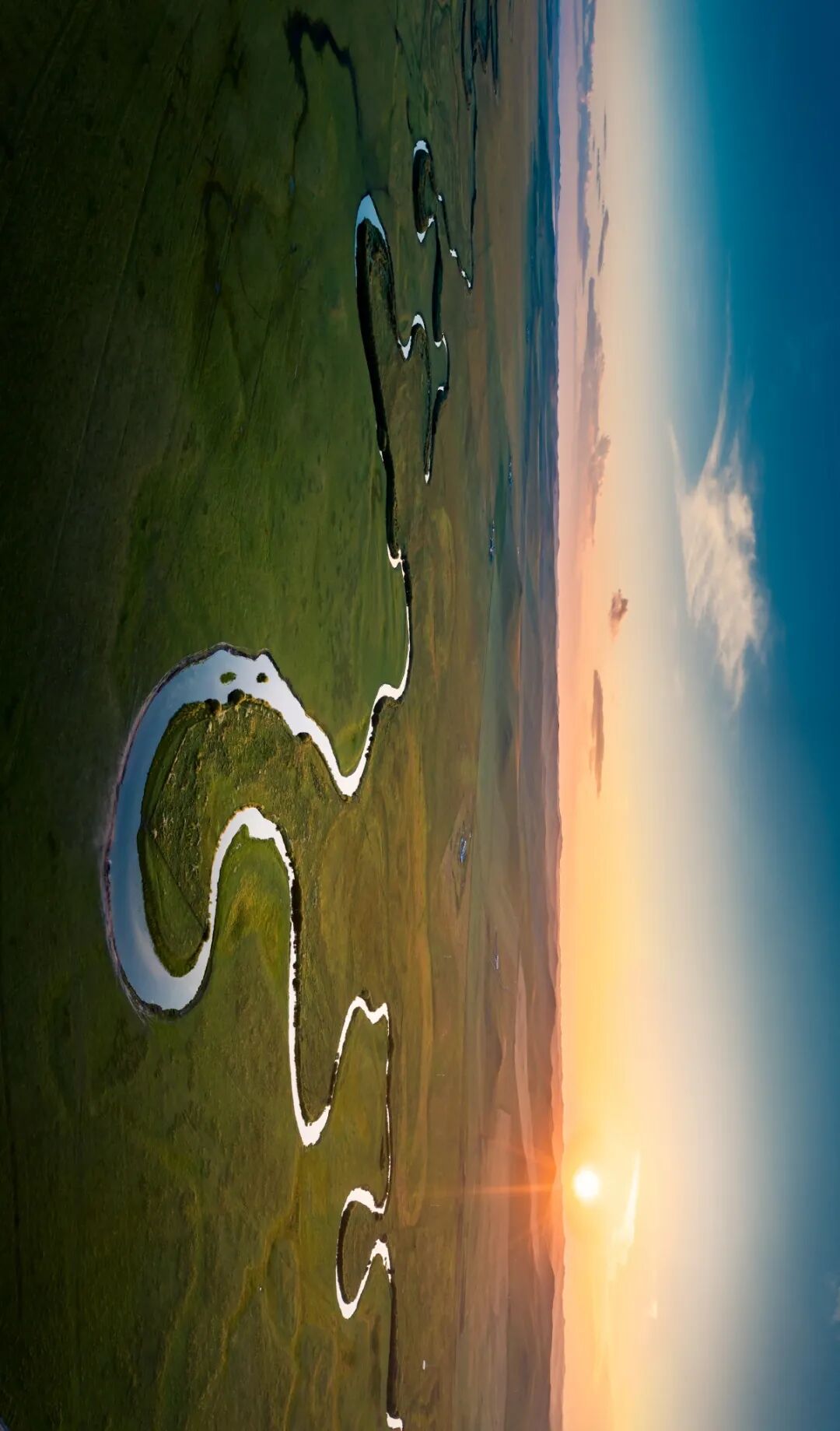 从阿尔山出来正式进入了内蒙古高原地带,又再次步入了草原。一望无际的大草原,草原上蓝天白云,其原生植被被保存较完整、草原类型繁多,是世界驰名的四大草原之一。乌拉盖河蜿蜒曲折,似一条银色的哈达镶钳在绿色的大地上,九曲湾位于乌拉盖湖东面,属乌拉盖河最为蜿蜒曲折的河段,河边绿草茵茵、野花丛生,香气袭人,牛羊成群,点缀其中。