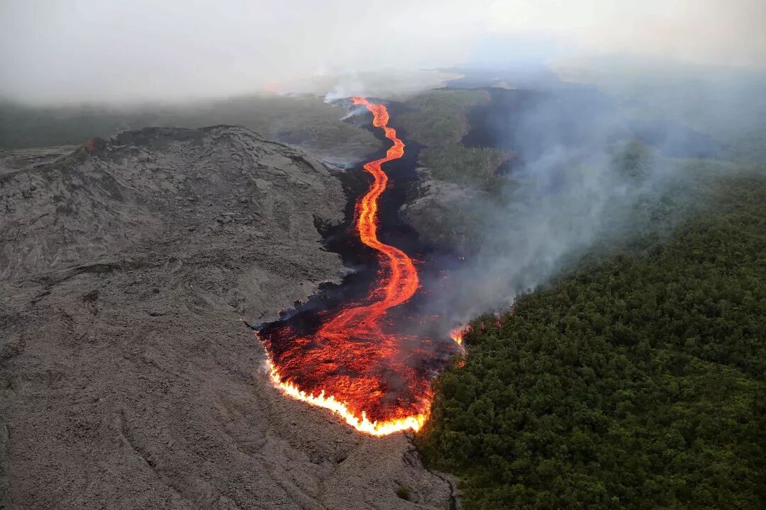 法国留尼汪岛,富尔奈斯火山的熔岩流灼烧着森林