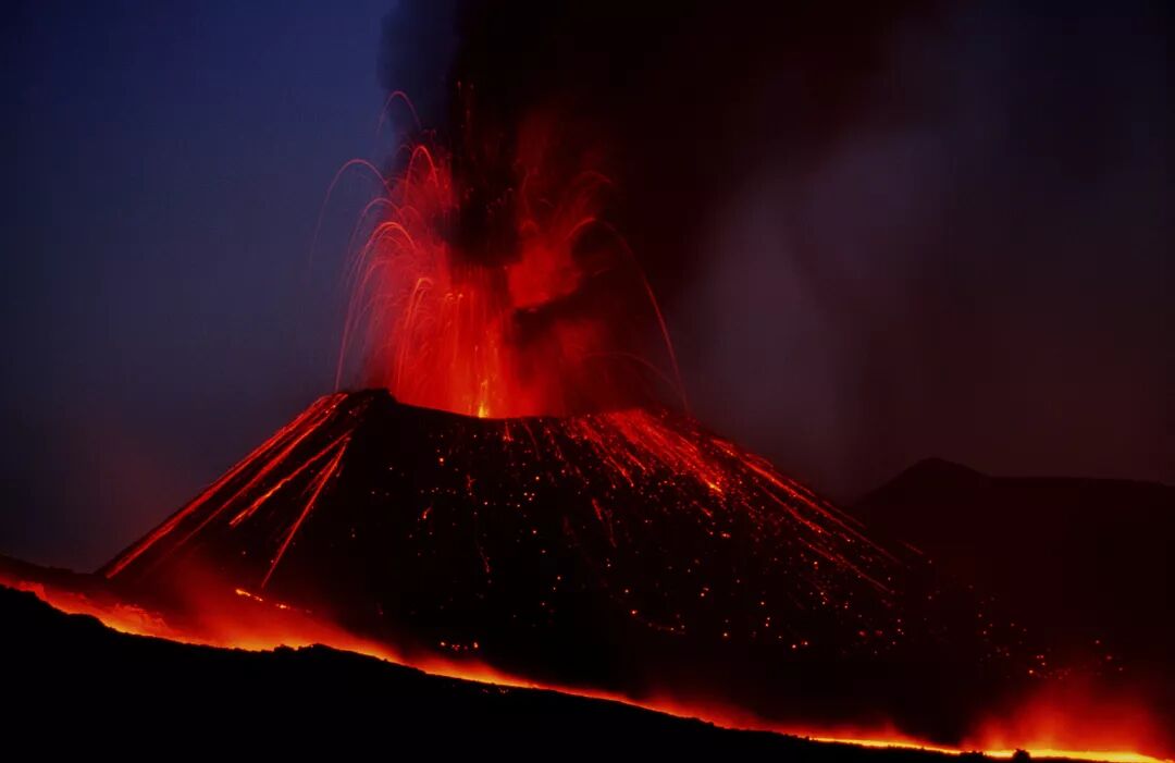 意大利西西里岛,埃特纳火山鲜红的喷发柱冲天而起。