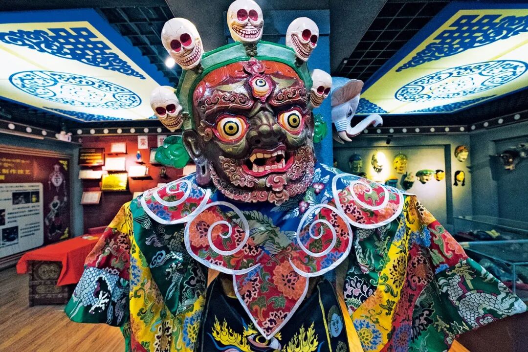 一位师傅正给藏戏面具用咖啡色的“泥”进行修饰