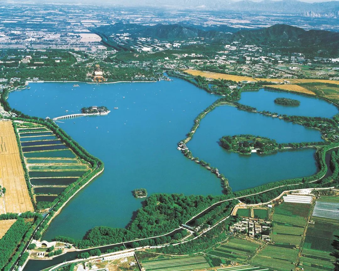 图为北京颐和园昆明湖。从秦汉时期开始,封建帝王常在宫苑内凿大池、筑三岛,模仿传说中仙人所居的三座仙山,营造出理想的神仙境界。