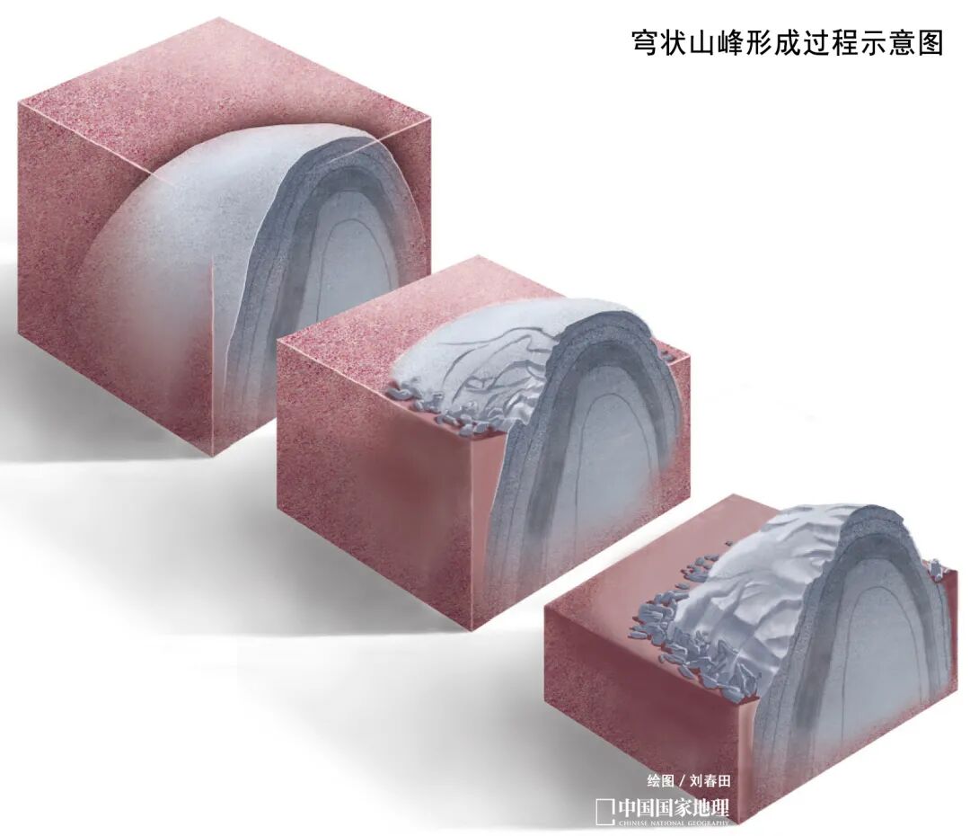 又由于这些穹状节理面的倾斜角度很陡,多在60°—75°以上,所以最终形成了既圆滑又陡峭的山坡面和山峰。