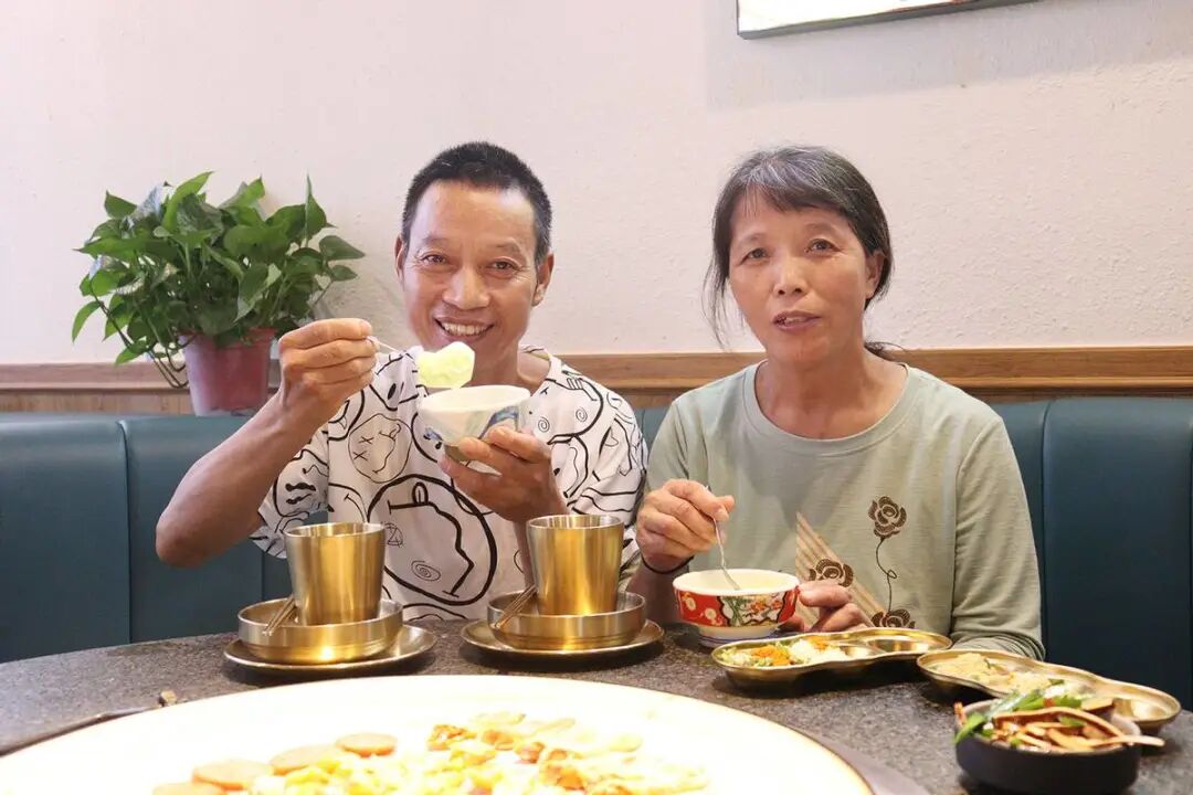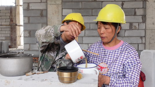 中午在工地上妻子给我做饭,尽管有时我们偶尔会拌嘴,但都抵不过互相为对方着想的感情。