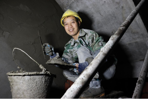 其实,做我们这行挺累,有时人踩在高高的脚手架上,弯腰直腰抹灰,一天下来腰酸背痛。