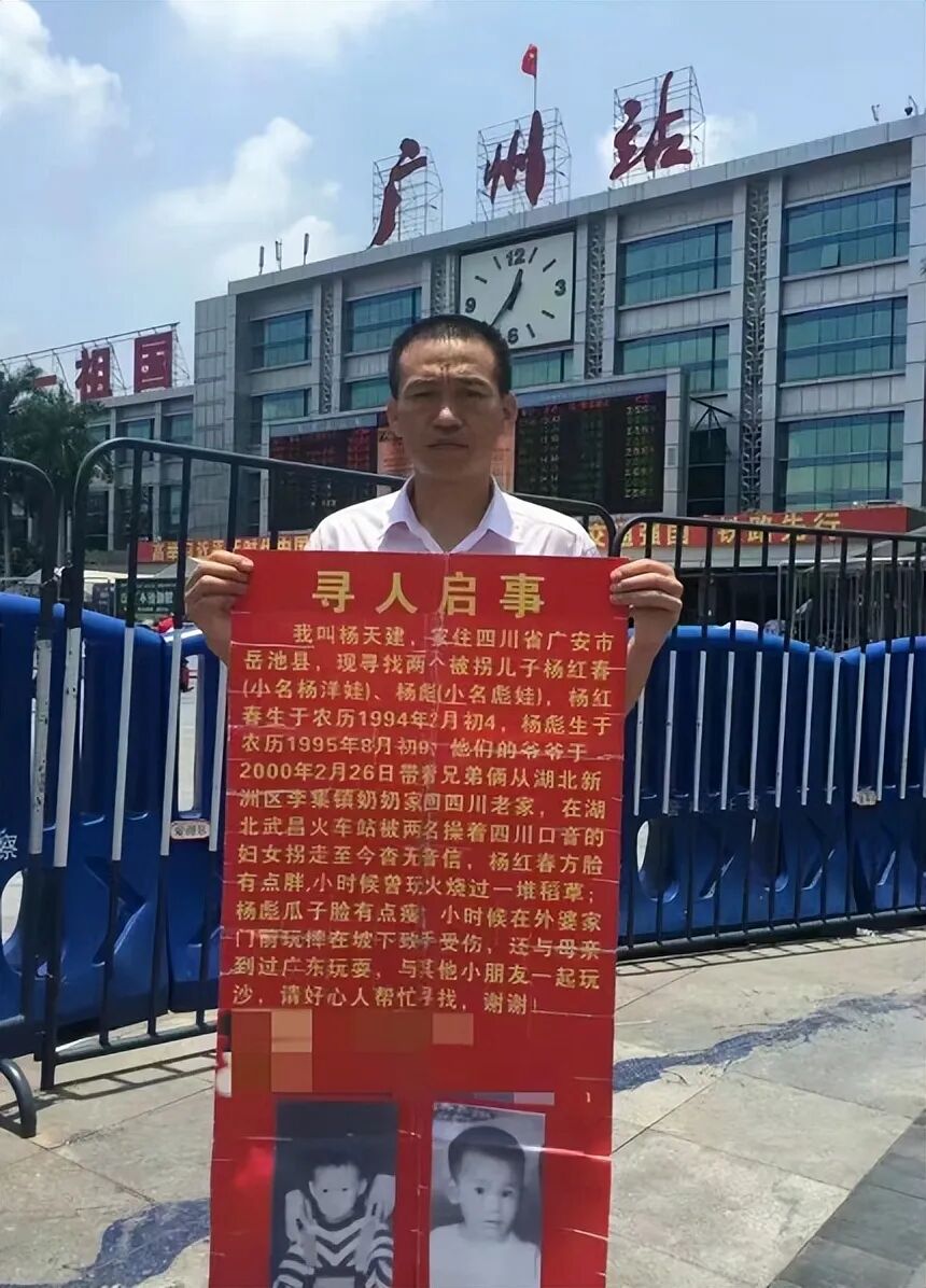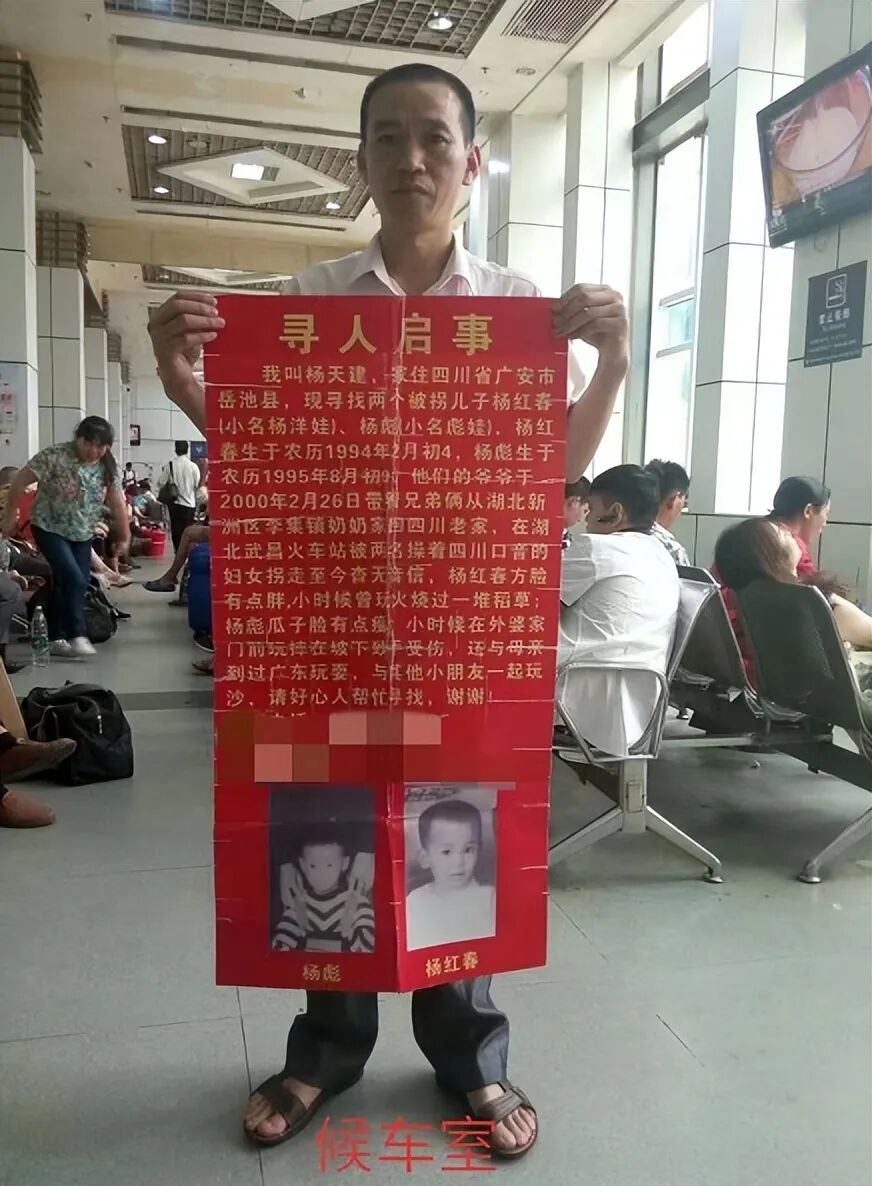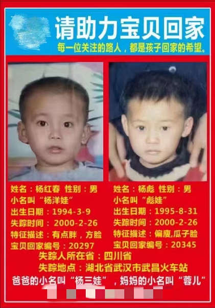 我的大儿子名叫杨红春,小儿子名叫杨彪。2000年2月26日,爷爷带着他俩从湖北回老家四川,在武昌火车站,两个孩子都被拐走了。