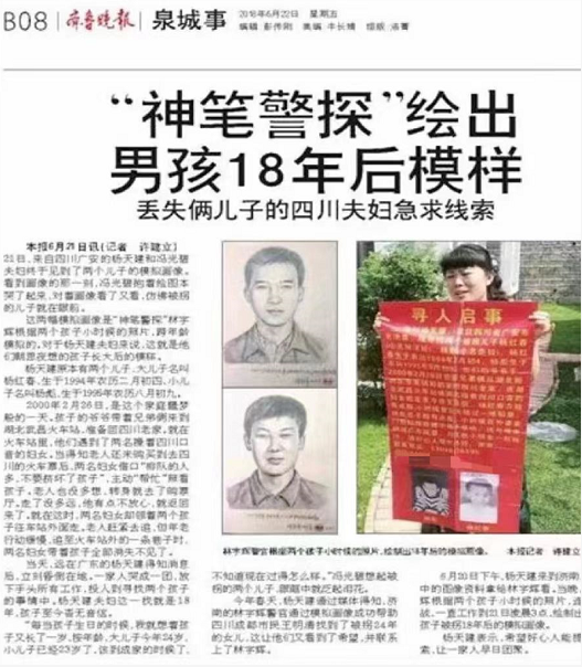 后来通过媒体的报道,得知山东省公安厅的画像专家通过画出失踪孩子长大后的“跨年龄像”,没多久就帮助寻亲的家属找到了孩子。