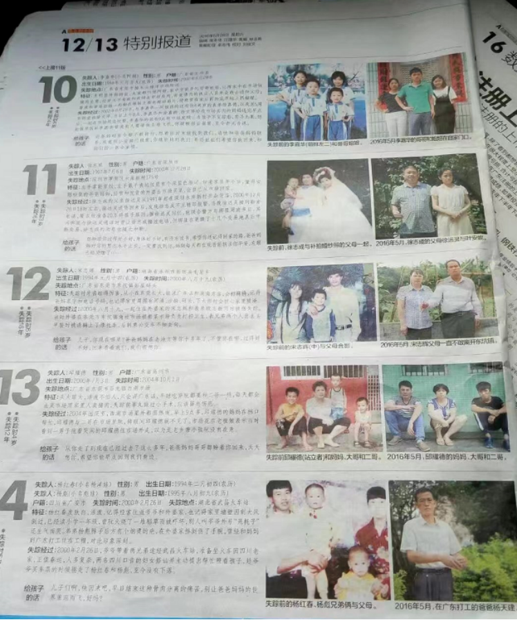 孩子刚失踪的头几个月,当时我还六神无主,偶然在报纸上看到深圳有一个帮忙寻找孩子的组织,我就迫不及待地打电话过去,没想到对方说要先收取寻亲费,一个孩子1万,两个孩子要收2万。