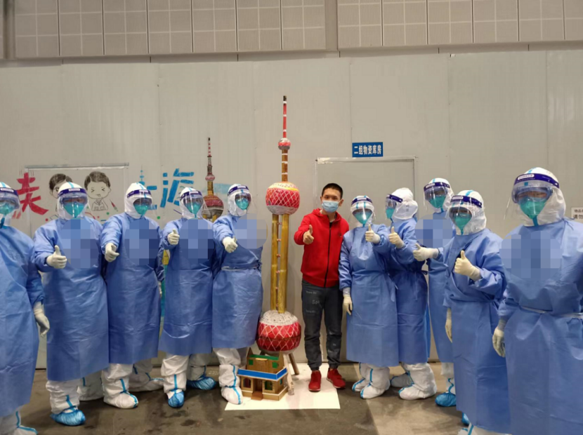 护士得知我会画画,就拿了一些绘画工具过来,我跟医护人员,还有志愿者,一起创作了很多抗疫作品。