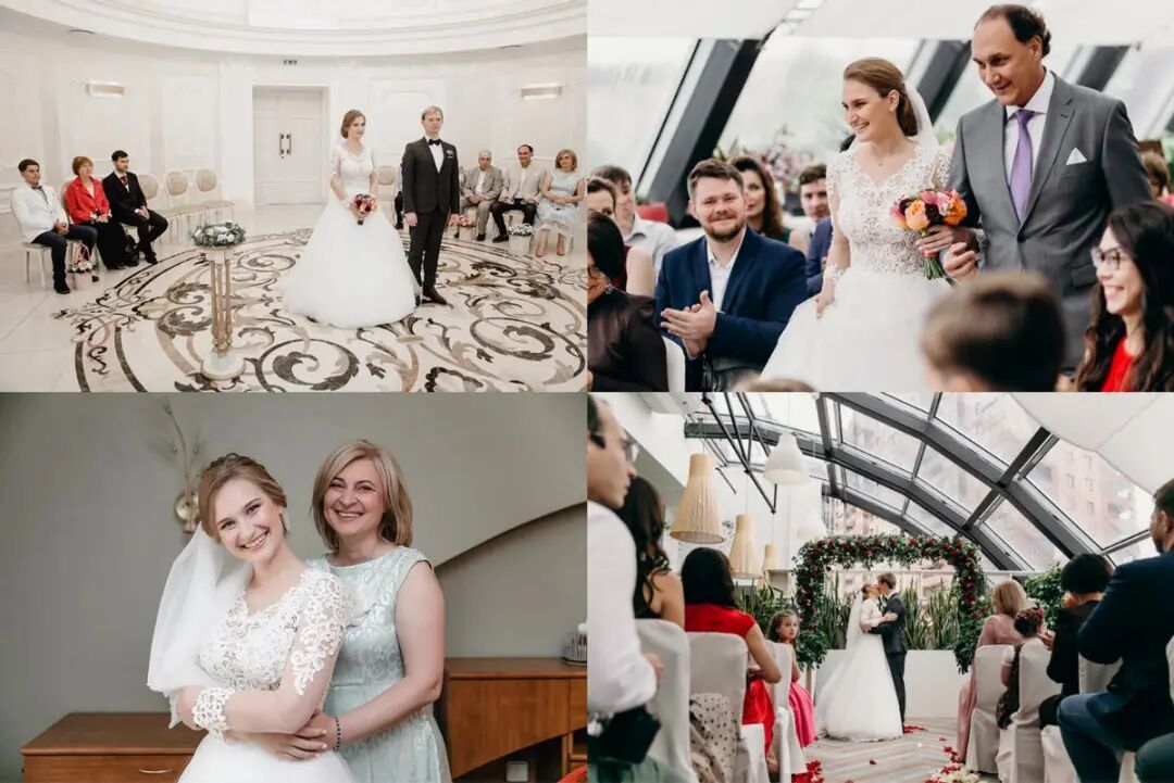 在俄罗斯,我们通常不会提前去拍婚纱照,而是在同一天完成与结婚相关的所有事情。一般上午去登记,然后参加聚会,下午四五点到晚上十点左右是婚礼。