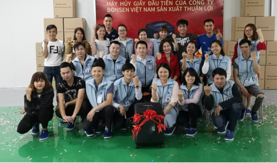 万事俱备只欠东风,2019年1月,东风也来了,流水线设备安装成功。2月14日,越南工厂的第一台碎纸机面世。