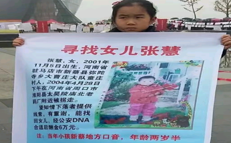 我女儿张慧,2001年11月5日,出生于河南省驻马店市新蔡县。于2004年4月28日,在河南省周口淮阳县疑似被一个年轻女人拐骗走,年仅2岁半。
