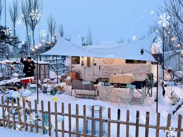 路上遇到下大雪,我们把房车停在服务区过夜,嫩芽哆哆嗦嗦地去打了热水回房车洗漱,天气特别冷,但我们觉得很有意思。