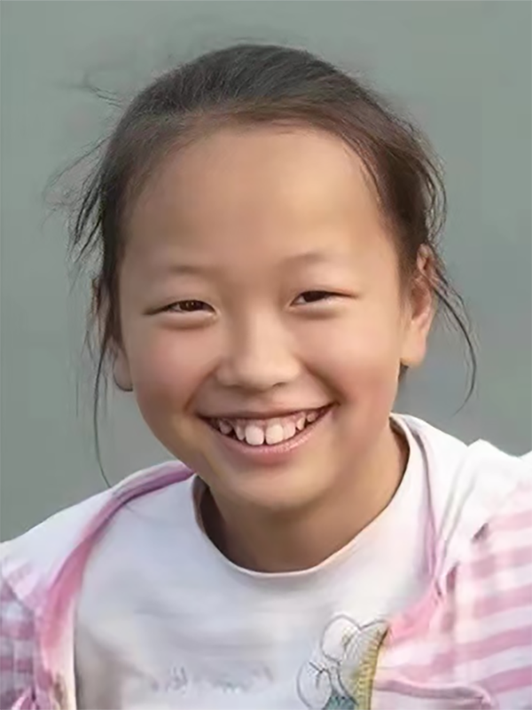 失踪时身高1米42,偏瘦,眼睛近视,有两颗门牙较大,脸上多痣,扎马尾辫。当天上身穿白色连帽短上衣,前胸印有一排红色英文字母,下身穿白色到膝盖短裤,脚穿红色凉鞋。