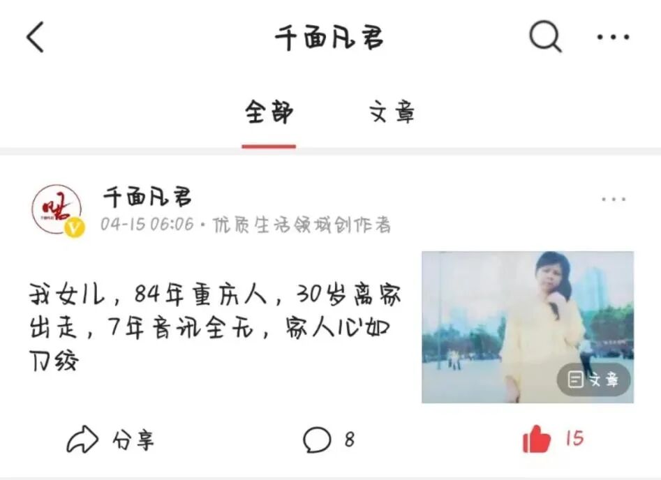 但我没想到写作挣钱的同时,竟然还能做公益,原来账号一直与平台寻人栏目有合作。