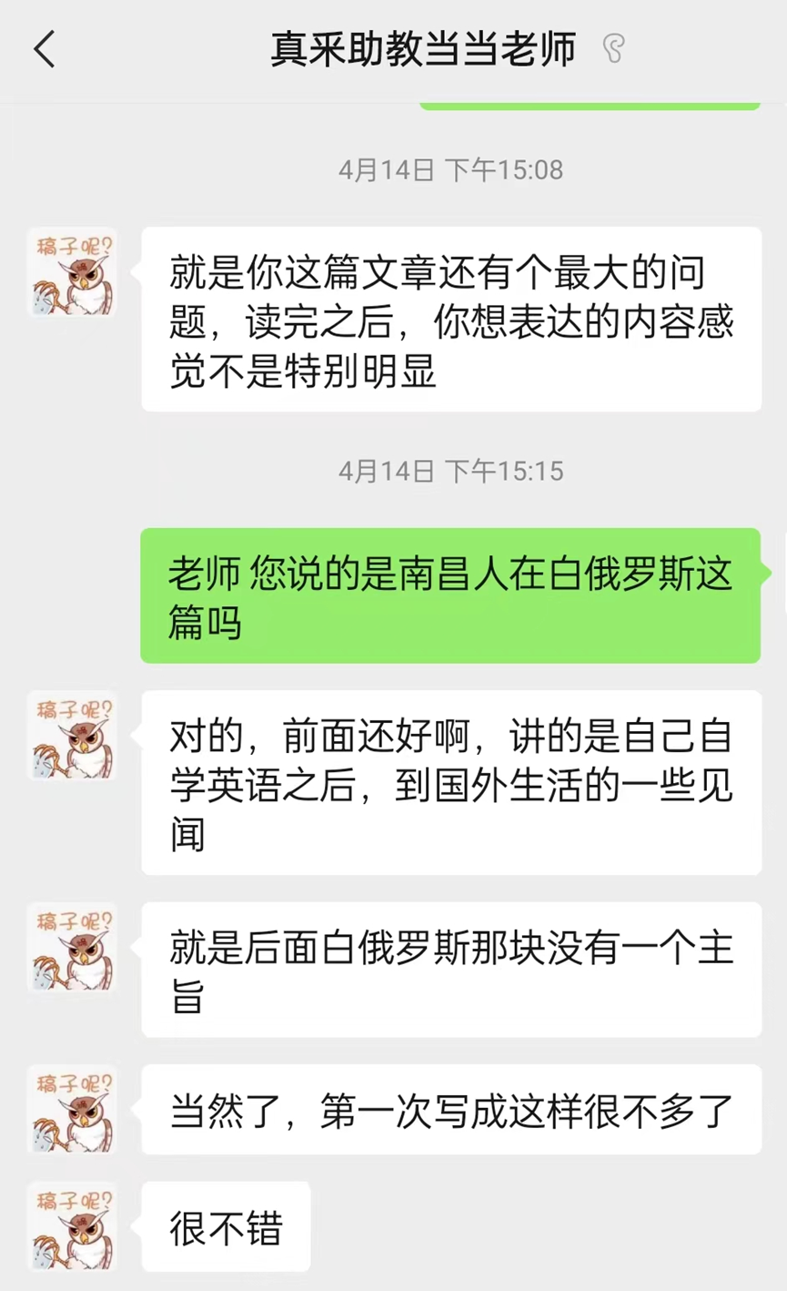 很快,我的第一篇文章出炉了。虽然整体问题不大,但是细节却有很多缺失。老师从主题,到情感带入,专门帮忙做了详细讲解。