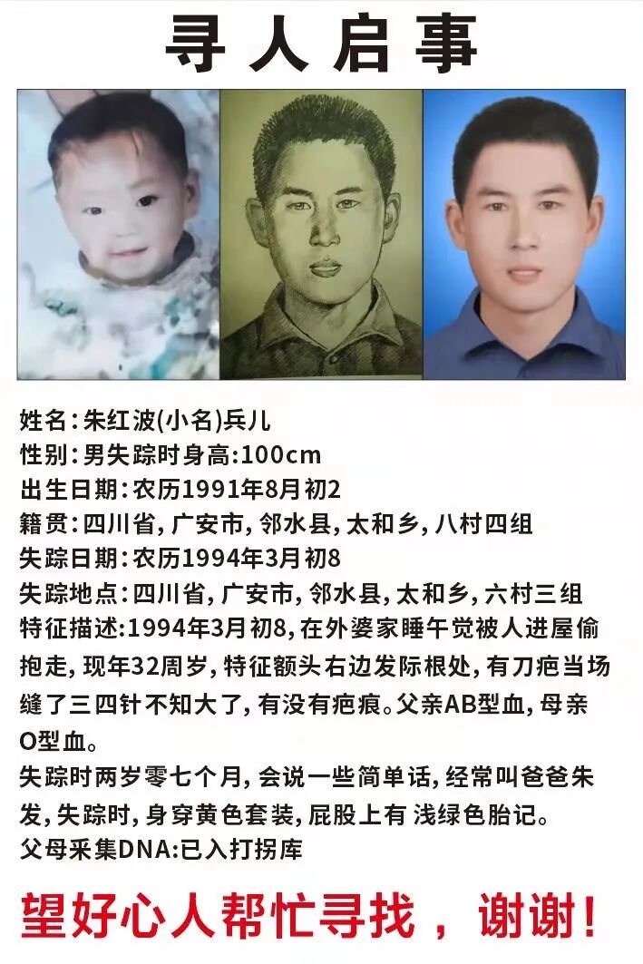 儿子叫朱红波,小名兵儿,兵兵,今年31岁。1991年8月2日(农历)出生于四川省广安市邻水县太和乡八村4组。1994年3月8日(农历)中午失踪。