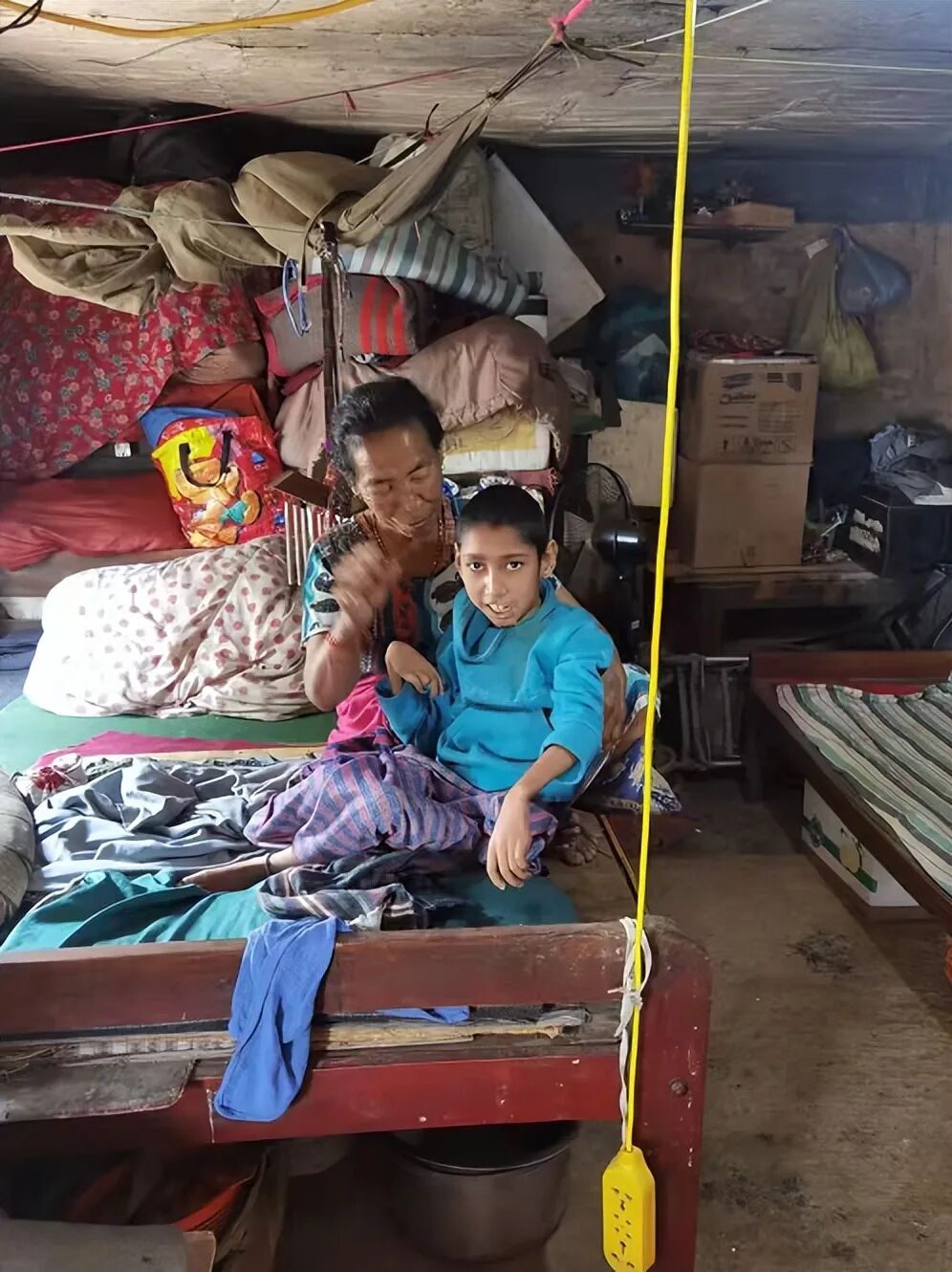 妈妈大概五六十岁,孩子因为患病的原因,看不出年龄,估计十多岁的样子。