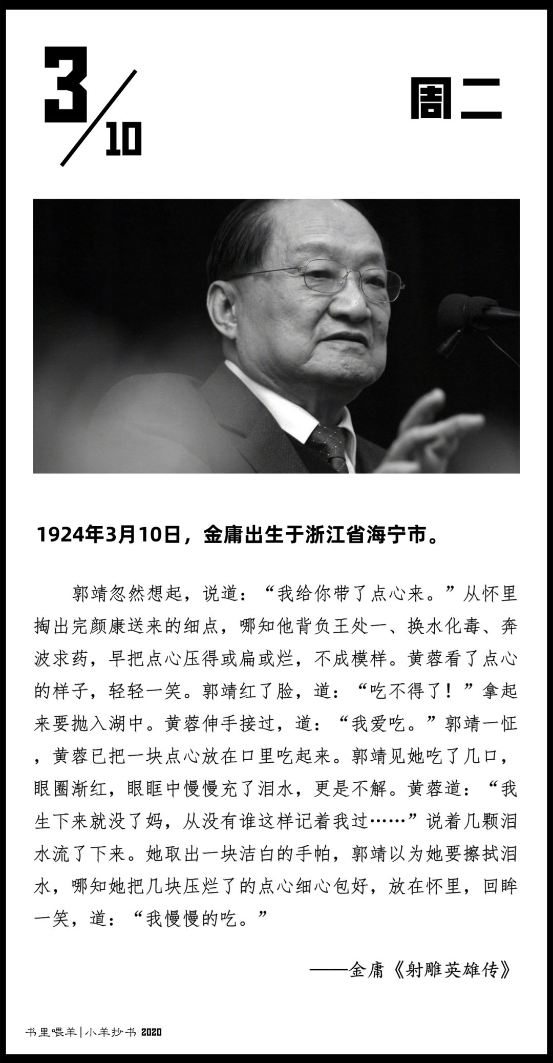 这位当代最知名的武侠小说作家,“以铁肩担道义,以妙手著文章”,一生笔耕不辍,留下皇皇巨著十五部。“飞雪连天射白鹿,笑书神侠倚碧鸳”,是无数人的武侠启蒙读物。