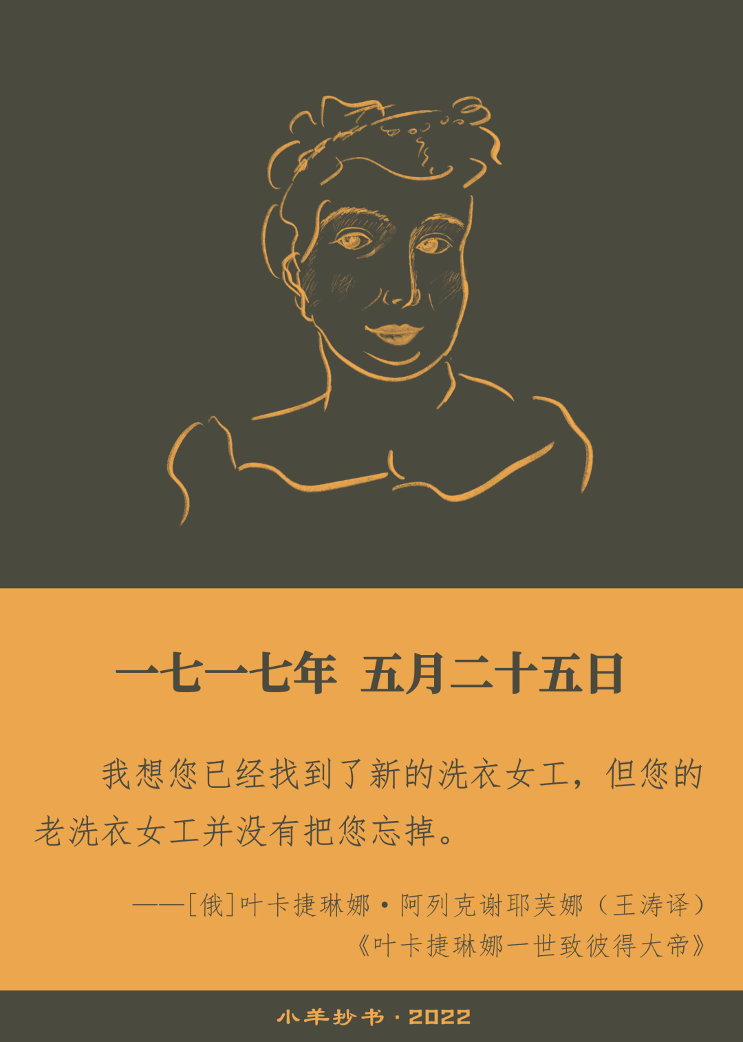 注:叶卡捷琳娜一世是一位立陶宛农民的女儿,曾经是洗衣女工。1707年,叶卡捷琳娜一世与彼得大帝在圣彼得堡秘密成婚,二人感情很好,时常在通信中说些俏皮话,拿别的女孩相互逗乐,尤其是洗衣女工。这封信写于1717年彼得大帝访问凡尔赛期间。