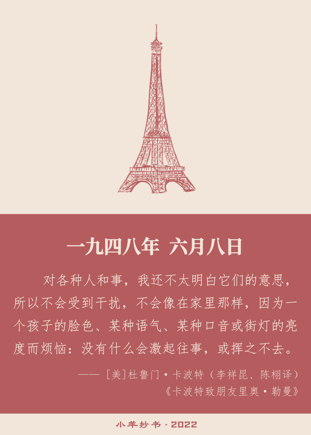 注:这封信写于巴黎。卡波特非常享受在巴黎的生活,说自己“有生以来唯一一次感到真正放松”。同样是在这封信中,他写道,“离开美国是我当时所能做的最正确之举,只要我现在好好安排;来到这里,远离多少年来一直让我深感痛苦的各种压力,这种解脱感——尽管可能只是暂时的——我简直难以形容。”