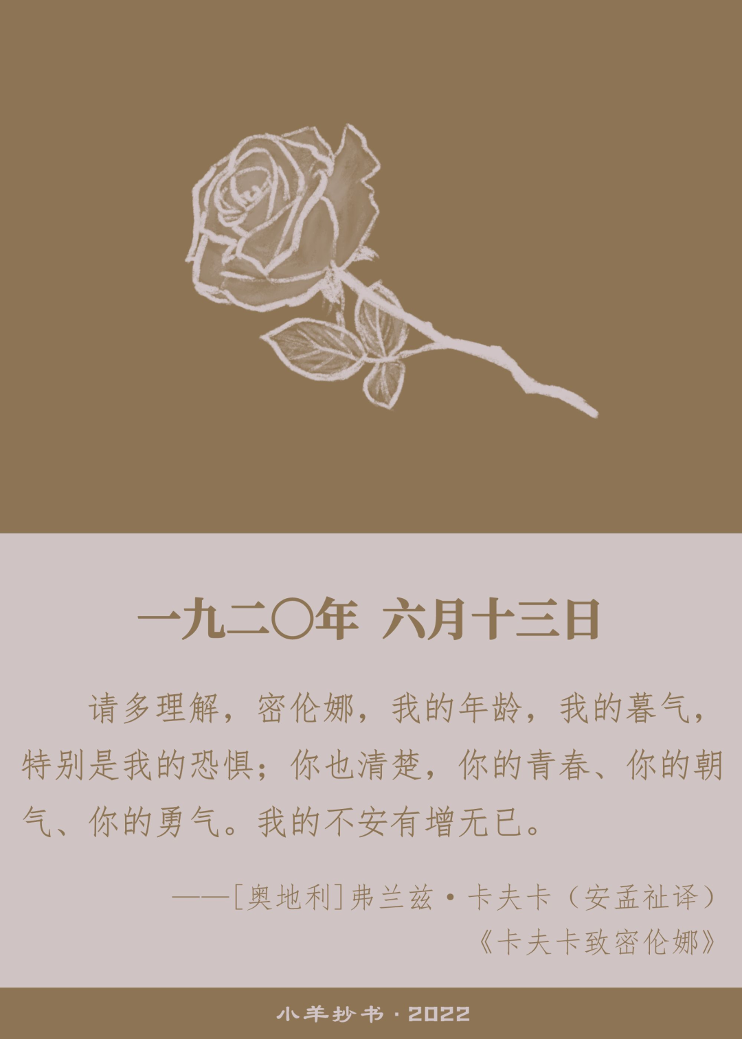 注:在卡夫卡三十七岁这年,一个真正走进卡夫卡内心世界的女人——密伦娜出现了。密伦娜比卡夫卡小十三岁,她热情奔放,性格与卡夫卡完全相反。十八岁时,她为了追求炽热的爱情,与恋人私奔结婚,而婚后丈夫并没有忠诚地守护他们的婚姻。正当密伦娜的婚姻生活被丈夫的朝三暮四一点点瓦解时,她在一个文学沙龙上遇到了卡夫卡。他们从友情迅速发展为爱情,并开始书信往来。与菲利斯一样,密伦娜渴望婚姻生活,她不能接受卡夫卡空有精神与灵魂的交流却没有实质生活内容的爱情。戴着长久以来无法摆脱的心灵枷锁,卡夫卡一面狂热地爱着密伦娜,一面又非常害怕和她在一起,最终两人还是分开了。
