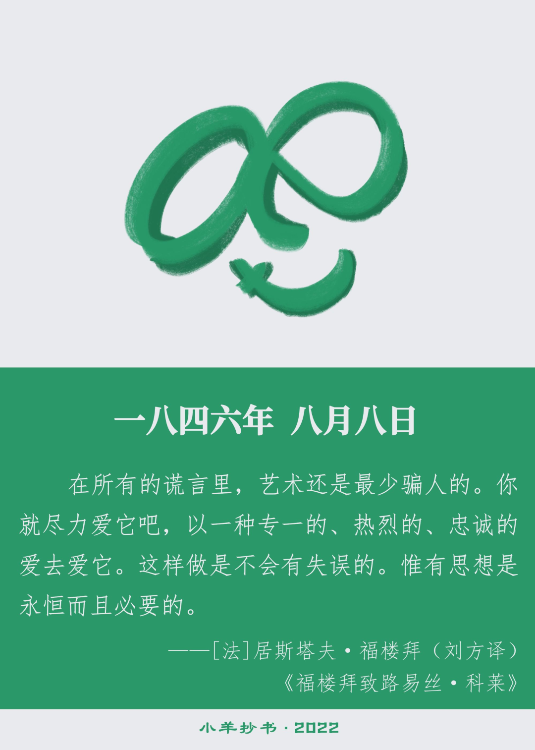 注:路易丝·科莱(Louise Colet,1810—1876),法国女诗人。1846年7月,25岁的福楼拜认识了已为人妻的35岁路易丝·科莱,不到一周两人即热恋,他一生的信札写得最多的就是给科莱的情书。但当科莱的丈夫去世,她正式向福楼拜求婚时,福楼拜坚持不答应,理由是:“假使我每天看到你,恐怕我爱你的热情就会降低了。”他们的恋情持续了八年。