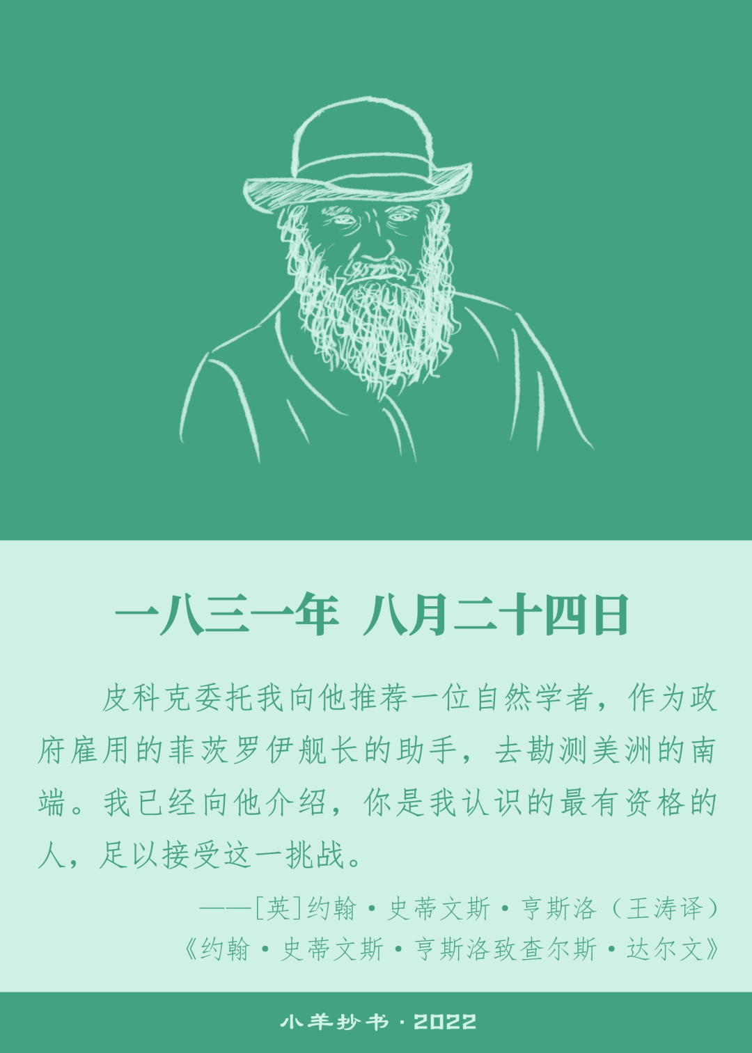 注:达尔文最终接受了约翰·史蒂文斯·亨斯洛的邀请,随英国皇家海军舰艇“比格尔”号前往南美洲探险。达尔文在“比格尔”号上的五年旅程最终促成了自然选择进化论的提出和《物种起源》的出版。(参考:[英]西蒙·蒙蒂菲奥里《书信中的世界史》)