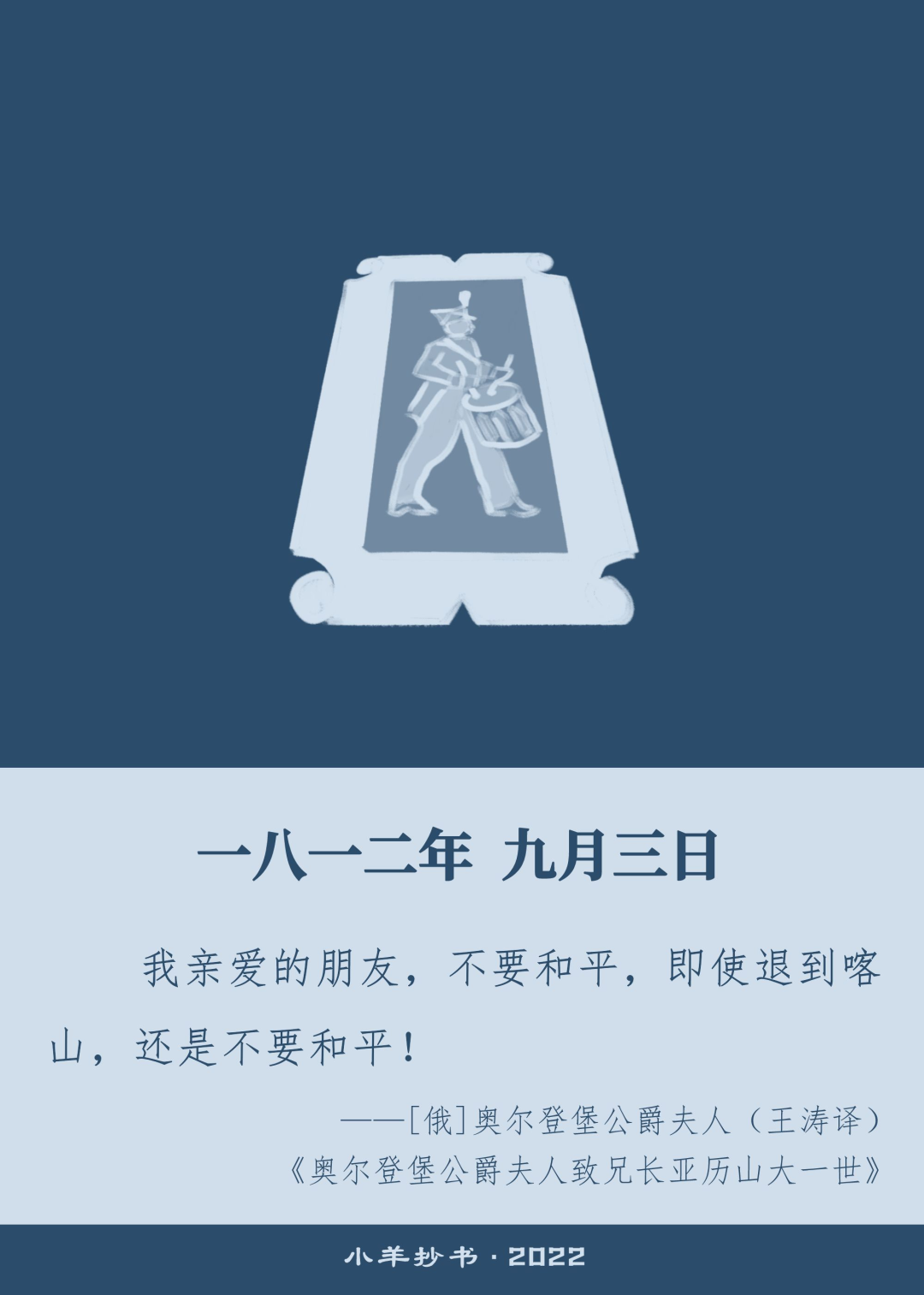 注:1812年夏天,拿破仑入侵俄罗斯帝国。9月,莫斯科被占领。这对沙皇亚历山大一世和俄国民众来说是令人震颤的耻辱。在这个灾难性的时刻,亚历山大一世的妹妹卡蒂奇(奥尔登堡公爵夫人)致信兄长,鼓舞他不惜一切代价组织抵抗,守护荣誉与声望。(参考:[英]西蒙·蒙蒂菲奥里《书信中的世界史》)