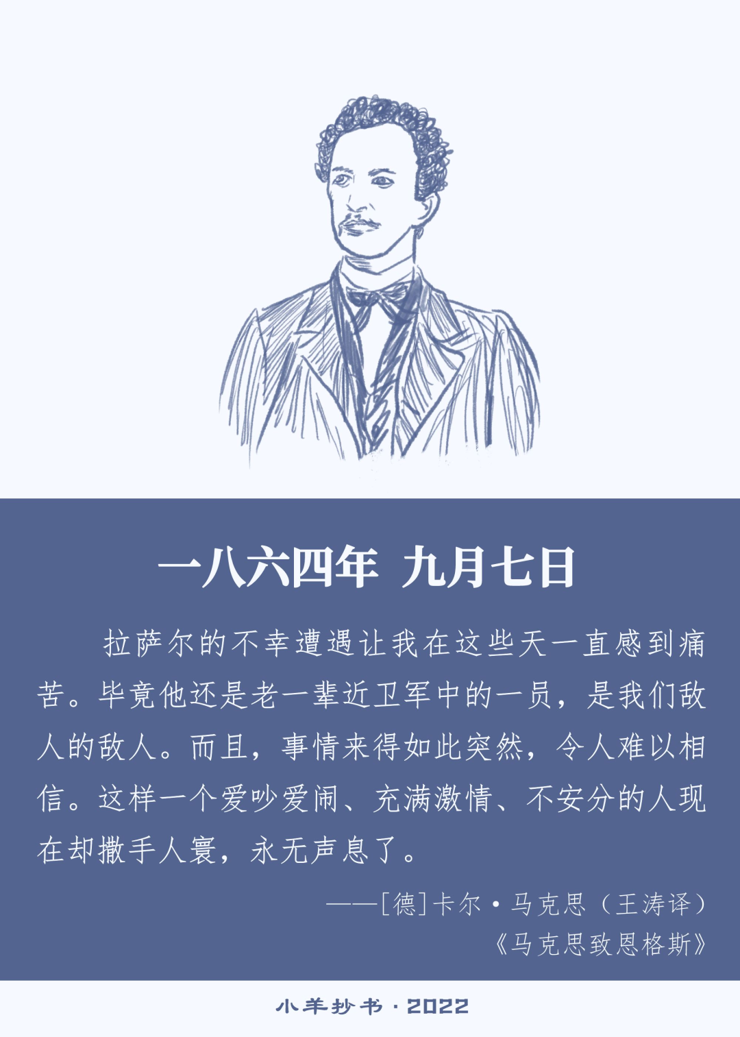 注:费迪南德·拉萨尔(Ferdinand Lassalle,1825—1864),德国早期工人运动活动家,机会主义代表人物之一,全德工人联合会创始人。1848年欧洲革命期间,参加杜塞尔多夫民主派的革命活动,并与马克思、恩格斯结识。他创建了自己的组织,并且得到情人冯·哈茨费尔特伯爵夫人的经济支持。拉萨尔如此有魅力和影响力,以至于“反动派”大臣俾斯麦伯爵都会秘密向他咨询。拉萨尔赏识马克思的天赋和创造性,帮助他出版著作。