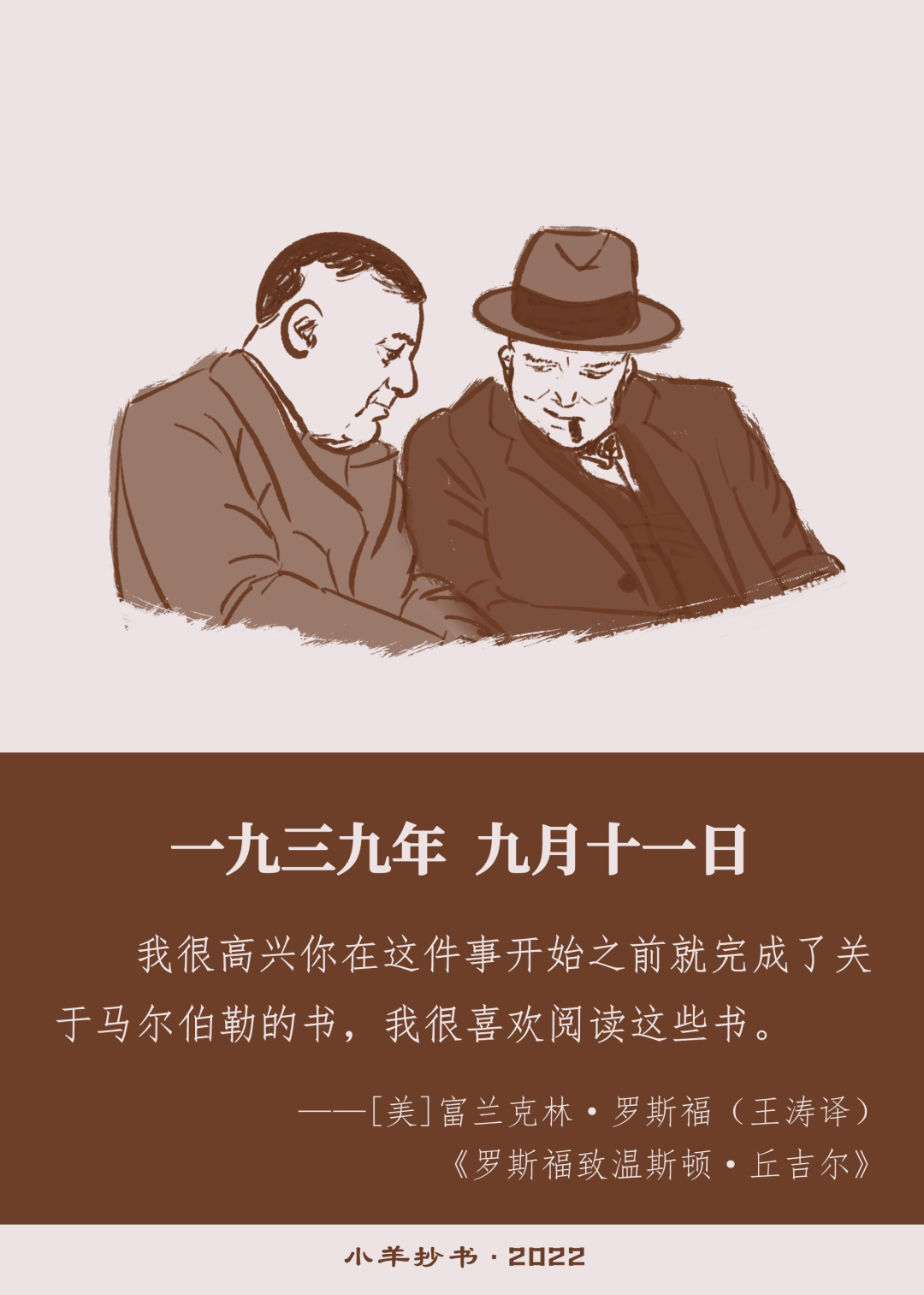 注:这是将西方团结在一起的第一封友情之信。1933年罗斯福赢得总统选举时,丘吉尔把自己的传记《马尔伯勒公爵》送给他,但他没有致谢。1939年9月,英国对德国宣战,丘吉尔重返内阁。罗斯福致信丘吉尔为六年前获赠的书道谢,并借此开始了与丘吉尔的秘密沟通。(参考:[英]西蒙·蒙蒂菲奥里《书信中的世界史》)