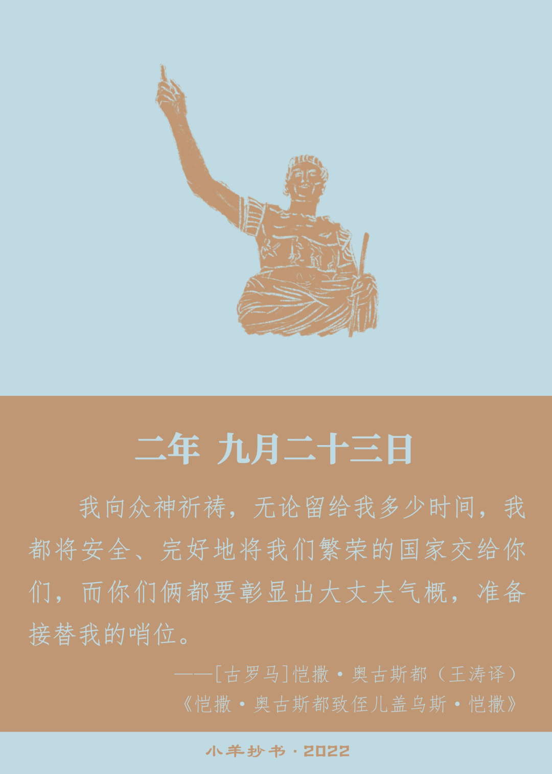注:恺撒·奥古斯都(屋大维)在65岁生日时写信给自己的继承人盖乌斯·恺撒。不幸的是,盖乌斯先于奥古斯都去世,未能接替他的“哨位”。(参考:[英]西蒙·蒙蒂菲奥里《书信中的世界史》)