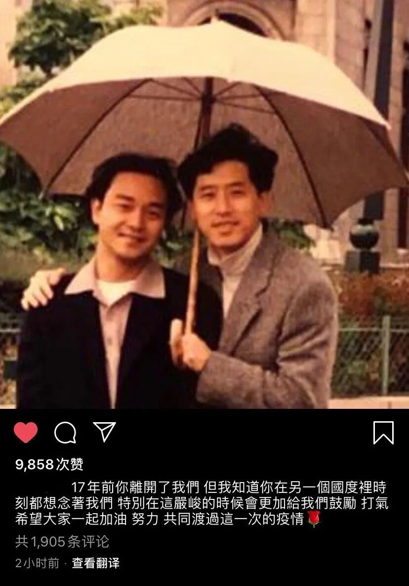 在哥哥逝世17周年之际,唐鹤德晒出与张国荣一起撑伞的合影并配文: