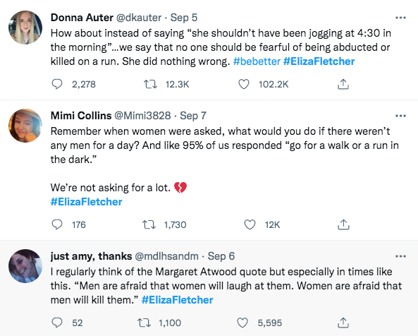 其他女性跑步者在推特上分享说,Elizabeth 不应该为这次袭击负责,并指出女性在跑步的任何时间和任何地点都应该是安全的。