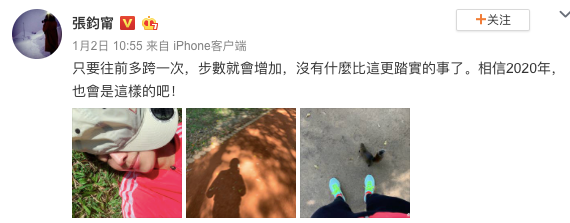 张钧甯接受采访时说过“跑步也好,人生也好,只要再多踏出一步就好。以前是用腿跑步,现在才懂,跑步其实是靠脑袋指挥。”