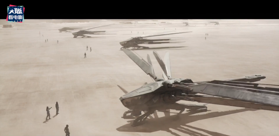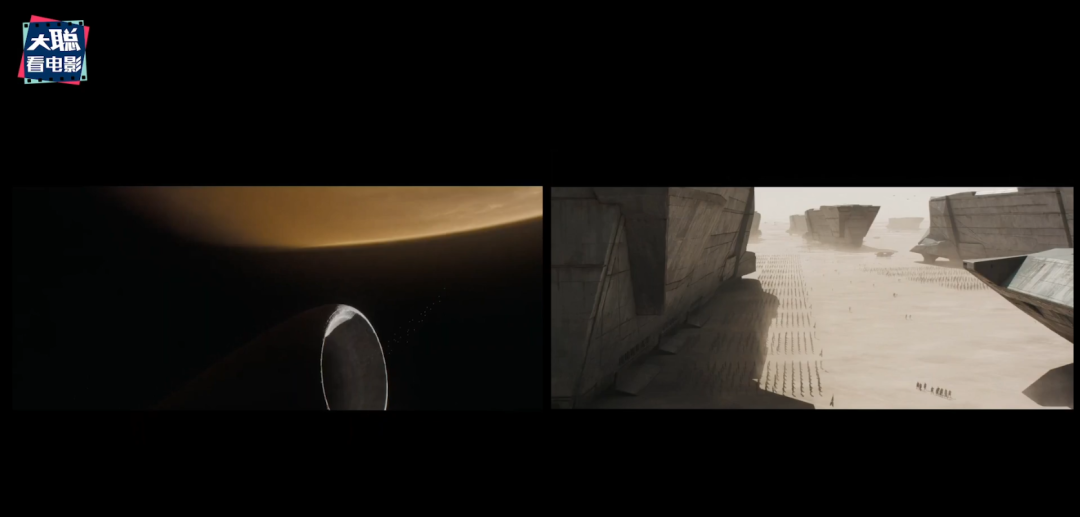 拿一个简单的例子来说好了,影片中巨型物体很多,如何把物体呈现最大化,大家都知道用对比,以人对比沙虫,以人对比飞船,但维伦纽瓦先用星球上空的巨型空间飞船对比降落舱,降落舱再对比人,如此交错对比,我们就可以脑补宇宙空间的那个庞然大物。