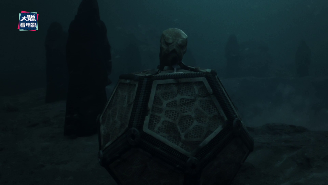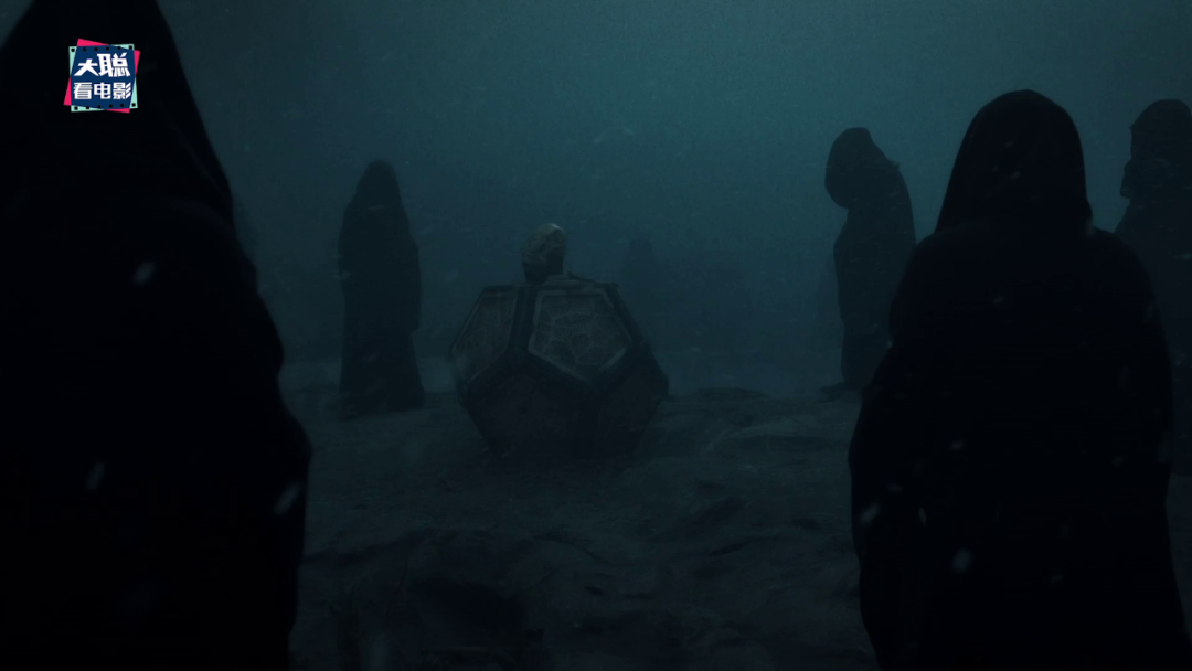在母亲读取银色卡牌时,看到了过去的信息影像,一群黑衣人对着12面体囚禁的异形生物,似乎做着宗教般的仪式。