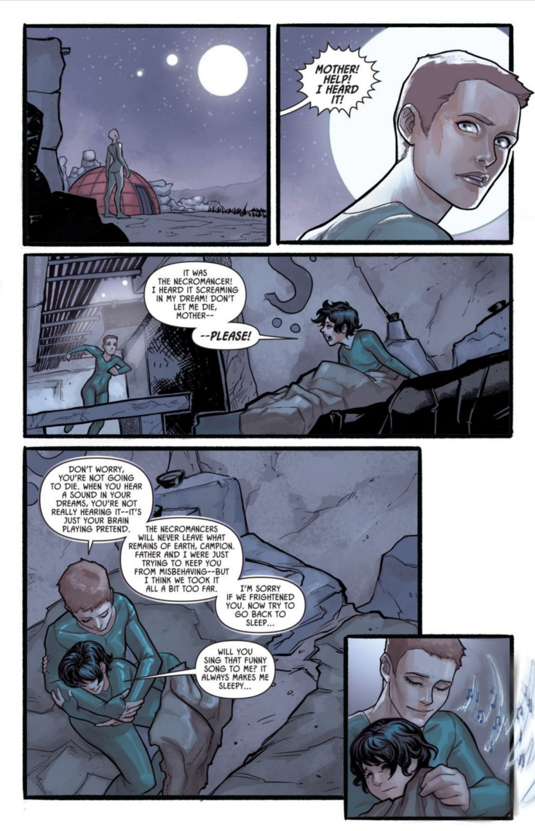 之后坎皮恩晚上做了噩梦,梦到自己被死灵机器追杀,母亲闻声赶到,并哼着小曲安慰坎皮恩。