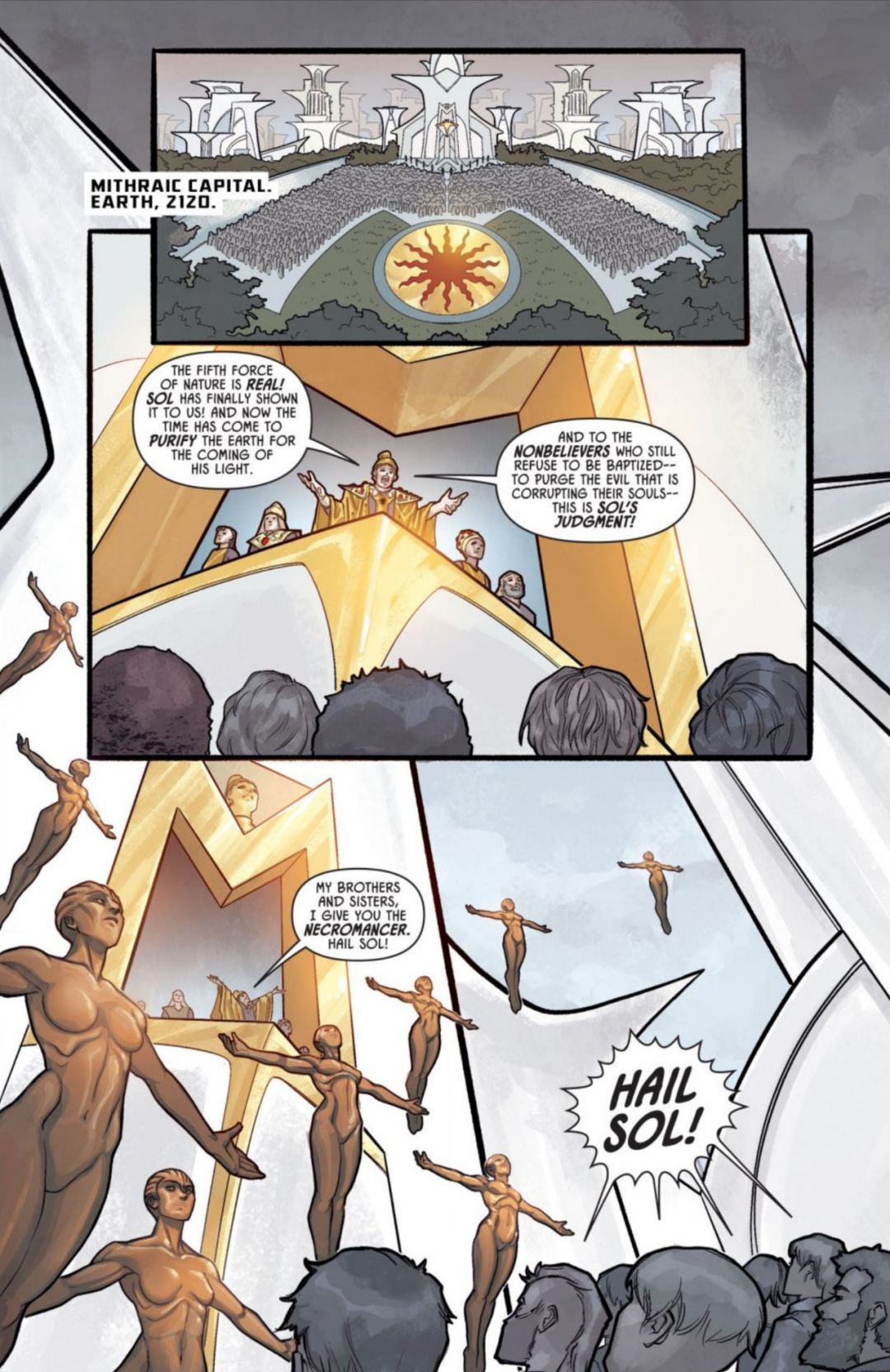 在《异星灾变》剧集播映的时候,线下还发布了一本相关漫画,仅有8页,但补充解释了密特拉教和地球的一些内容,后面我们会详聊,这里我们先清楚密特拉教在剧集中兴起大概是在2120年,而不是一直都那么强大的。
