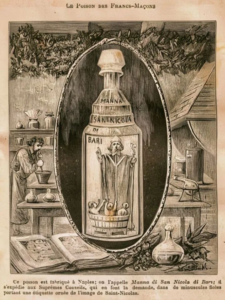 她的毒药香水据说是用砷、铅和剧毒植物合成,她还给它设计了好看的包装,印上了圣·尼古拉斯的头像(古罗马的一位主教,圣诞老人的原型),看上去仿佛是美德与美好的象征。