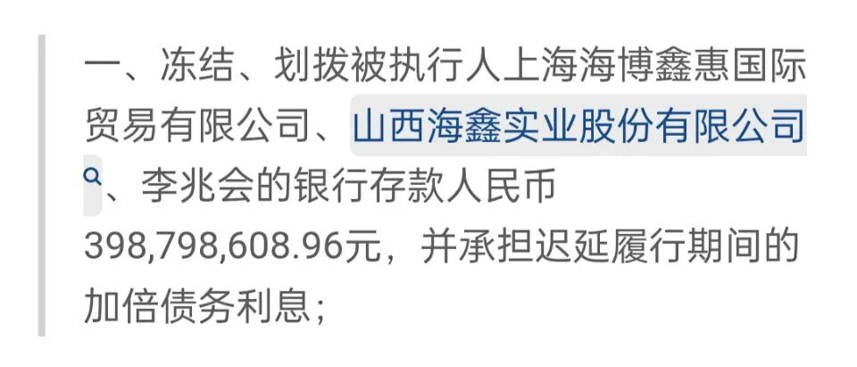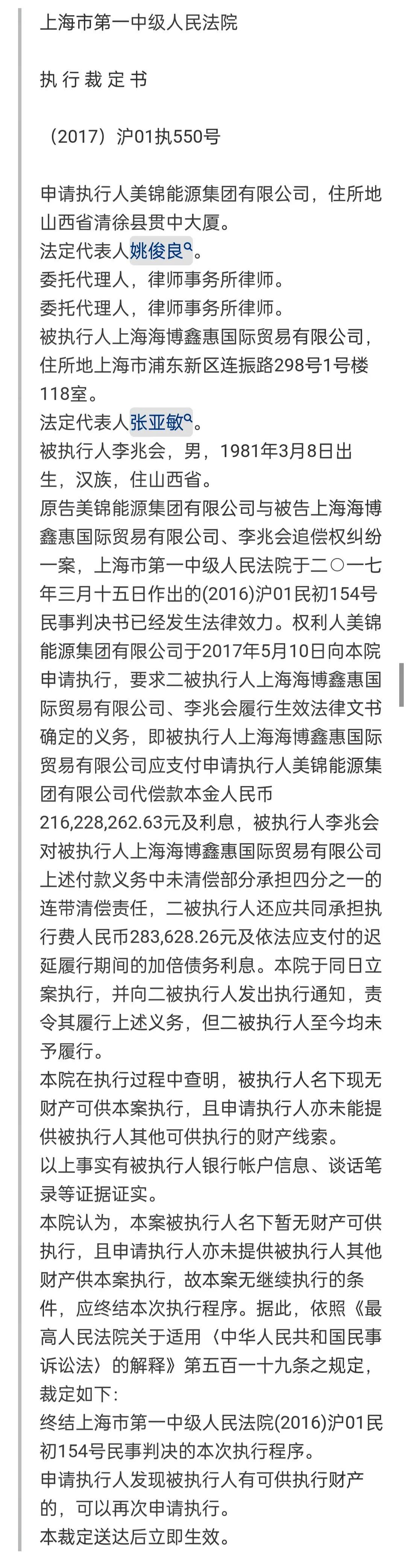 不过上海法院2017年的那次无效执行,却是牵连到海博鑫惠的。起诉方是美锦能源集团,总债务是2.162亿元加利息,其中李兆会需清偿的是四分之一,约5405万元。