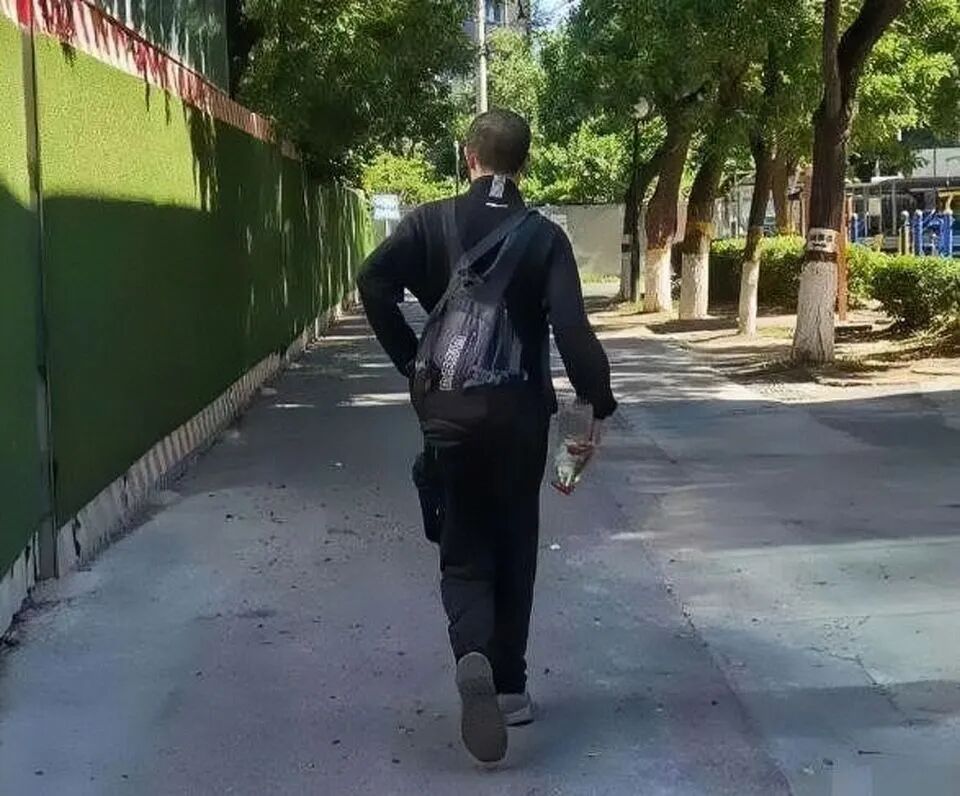 头发有点乱,形象不美好,手里还提着一瓶矿泉水,和两个馒头。