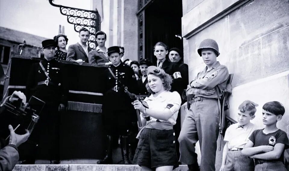 (沙特尔解放时,西蒙娜按照摄影师的要求摆拍。她成了一面旗帜。)